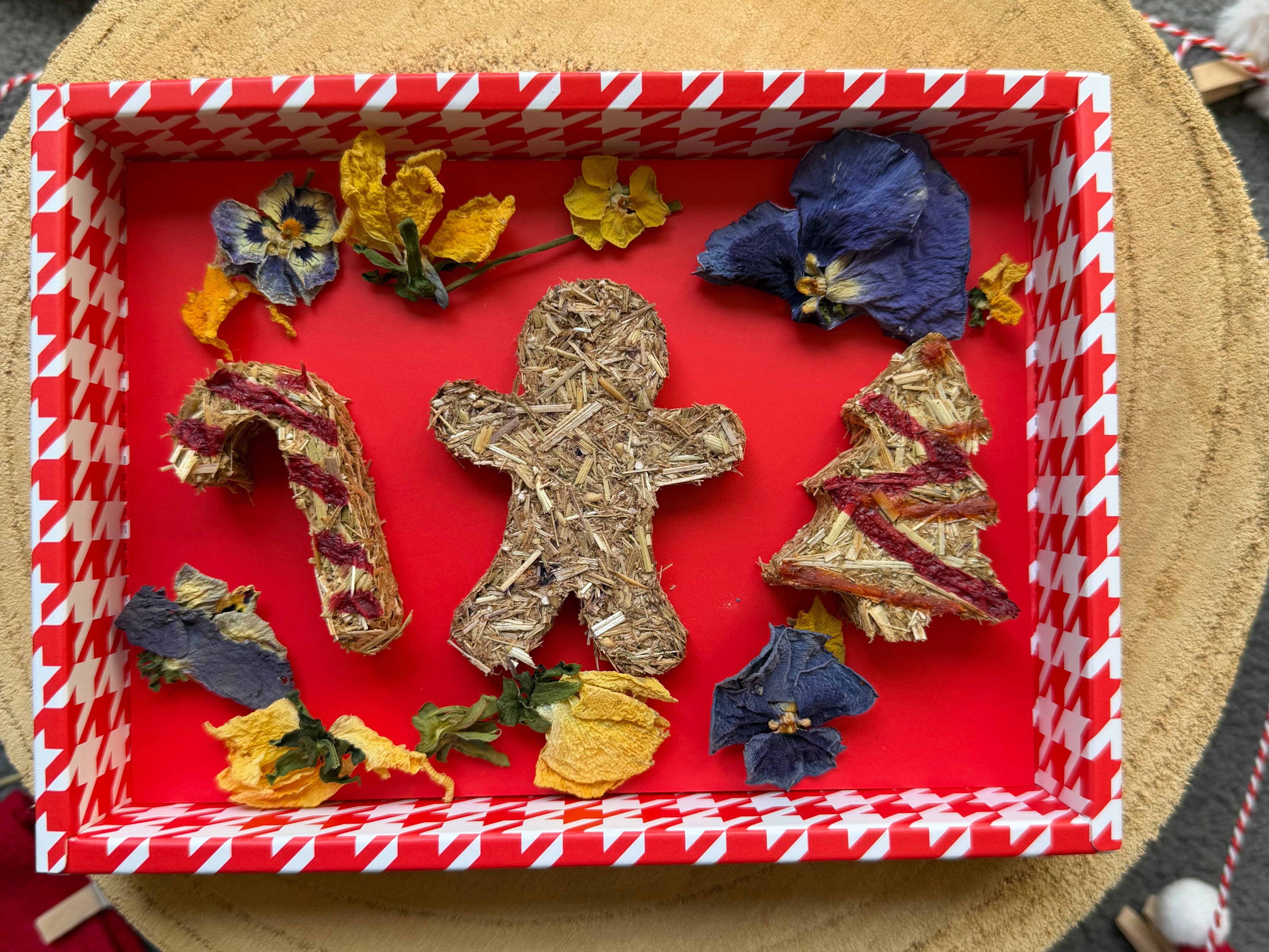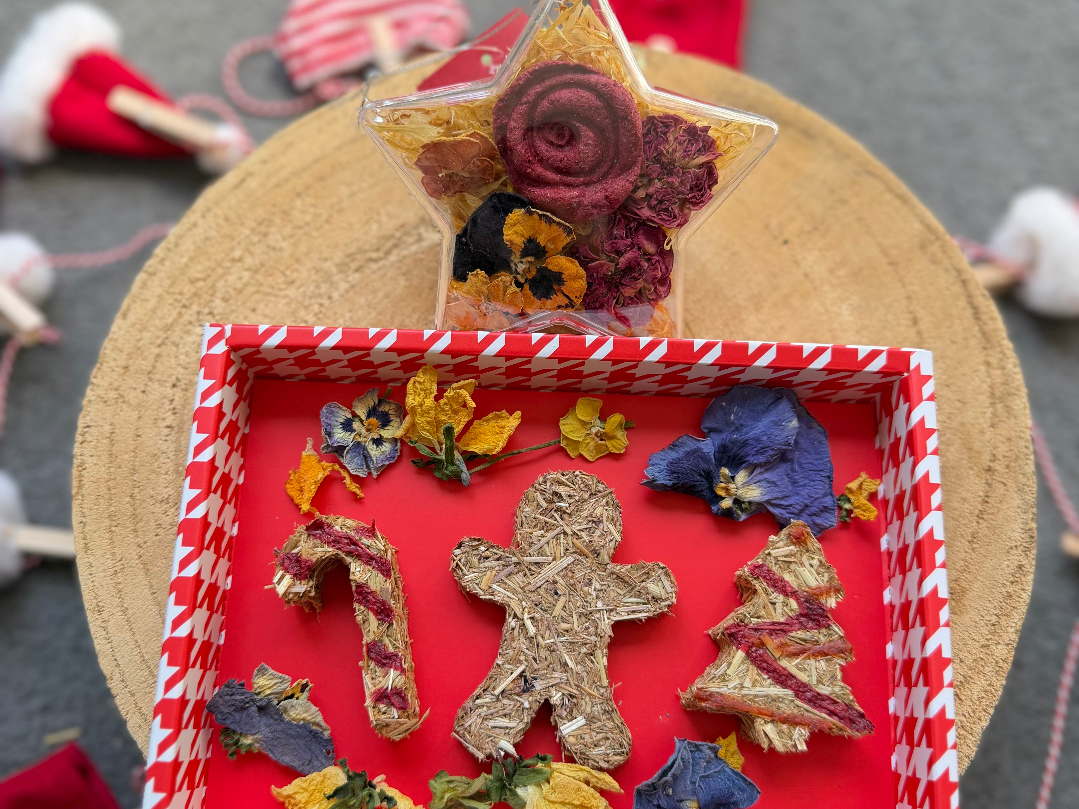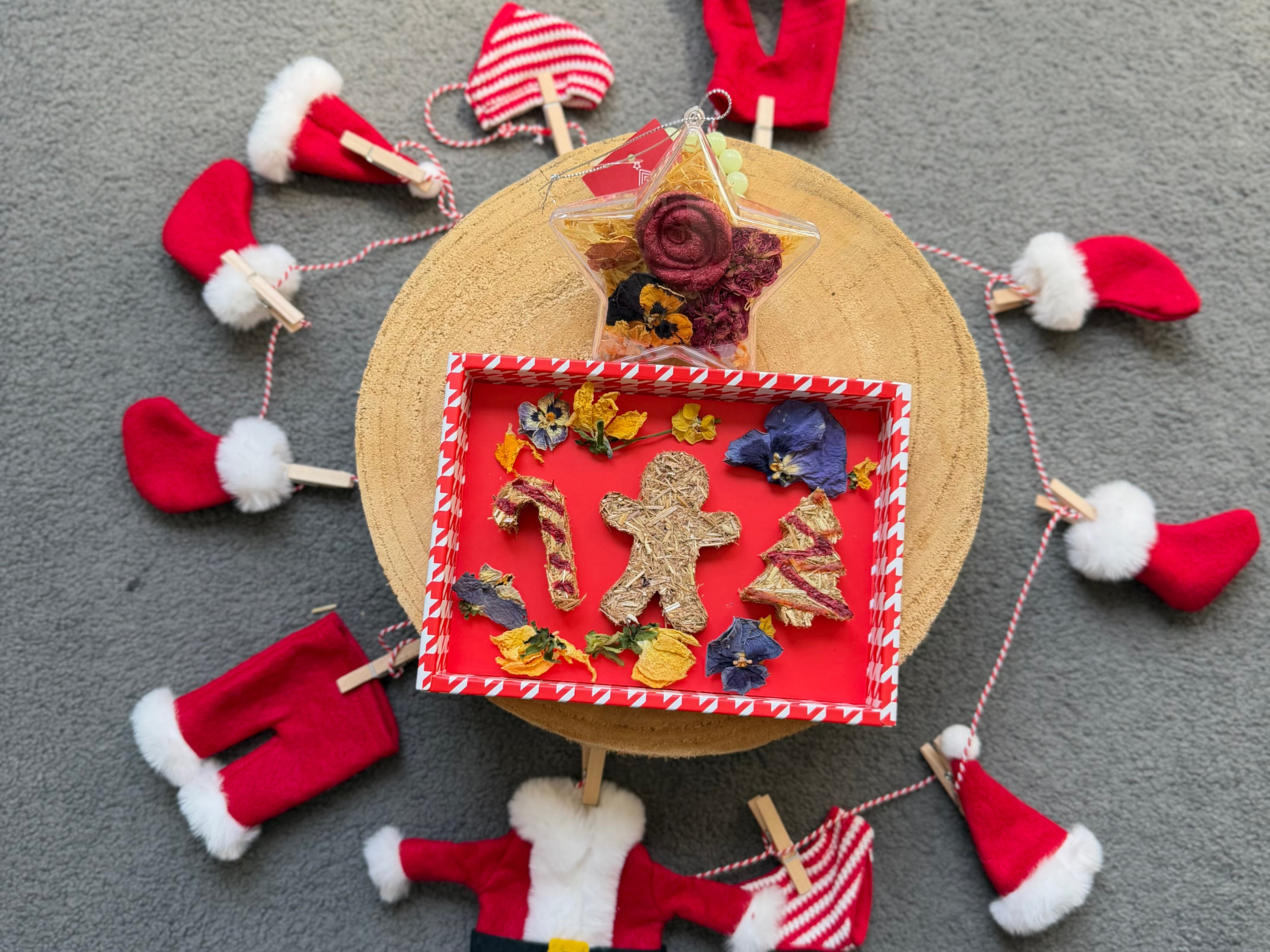 Christmas bauble: Calendula, Rose, Pansy, treats (oaten hay, berries) ___________________________________________________